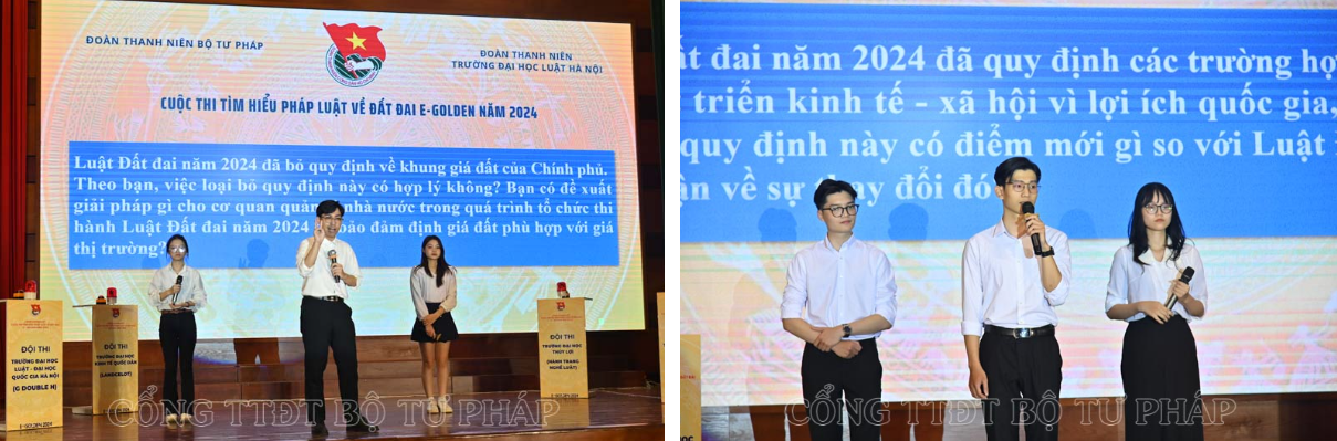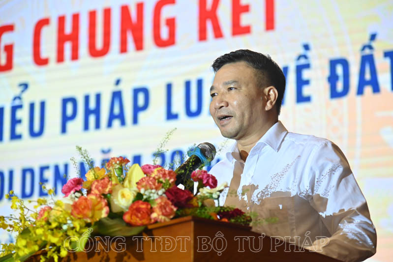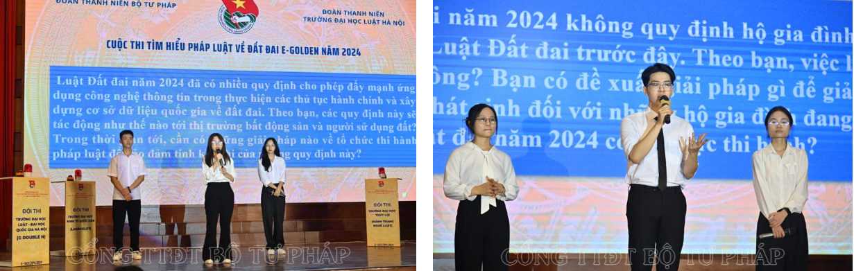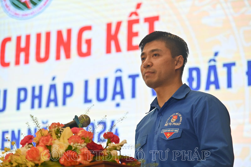 Phát biểu khai mạc Vòng Chung kết, đồng chí Trịnh Xuân Tùng – UVBCH Đoàn Khối, Bí thư Đoàn Thanh niên Bộ Tư pháp, Trưởng Ban Chỉ đạo Cuộc thi nêu rõ, cách đây hơn một tháng (ngày 07/5/2024), Lễ phát động Cuộc thi tìm hiểu pháp luật về đất đai E - Golden năm 2024 đã diễn ra thành công. Cuộc thi do Đoàn Thanh niên Bộ Tư pháp chủ trì, phối hợp với Đoàn Thanh niên Trường Đại học Luật Hà Nội tổ chức, là sân chơi trí tuệ danh cho tất cả các sinh viên luật đang theo học tại các trường Đại học trên địa bàn TP Hà Nội. Với mong muốn phổ biến sâu rộng các kiến thức pháp lý mới về đất đai, nội dung thi tập trung vào các chính sách, quy định của Luật Đất đai năm 2024 – đạo luật được Quốc hội khóa XV thông qua, nhằm phát huy vai trò xung kích, sáng tạo của Đoàn Thanh niên trong việc thực hiện nhiệm vụ chuyên môn của Bộ, ngành Tư pháp, góp phần đẩy mạnh công tác phổ biến, giáo dục pháp luật nói chung, công tác PBGDPL về đất đai nói riêng, tạo sự lan toả, hưởng ứng mạnh mẽ của người dân, doanh nghiệp, nhất là đội ngũ sinh viên trong tổ chức thi hành Luật Đất đai năm 2024, góp phần đổi mới, nâng cao chất lượng, hiệu quả công tác PBGDPL trong nhà trường.