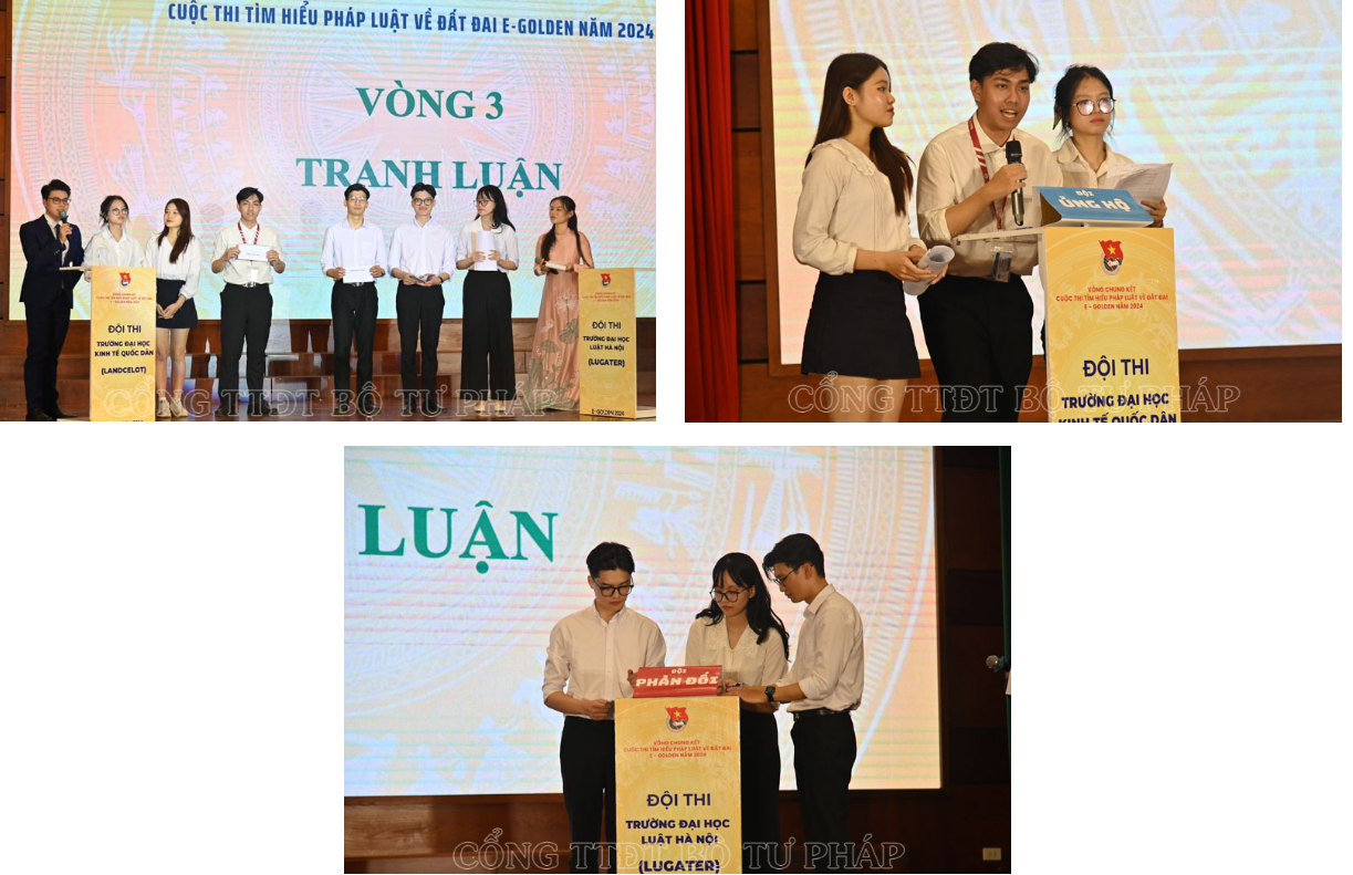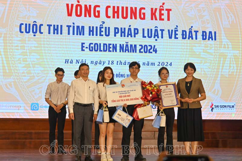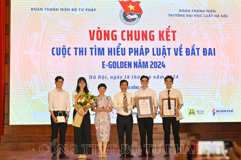 Sau nhiều giờ thi đấu, Đội thi “LUGATER” đến từ Trường Đại học Luật Hà Nội đã giành giải Nhất Cuộc thi tìm hiểu pháp luật Đất đai E-GOLDEN năm 2024; Đội thi “LANDCELOT” đến từ Trường Đại học Kinh tế Quốc dân giành giải Nhì và hai đội thi: “G DOUBLE H” đến từ Trường Đại học Luật - Đại học Quốc gia Hà Nội, “HÀNH TRANG NGHỀ LUẬT” đến từ Trường Đại học Thuỷ lợi giành giải Ba.