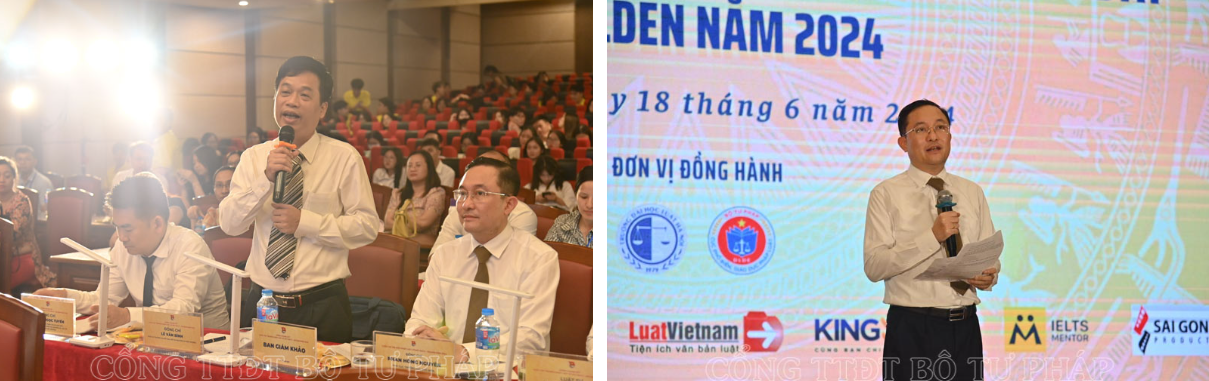 Đại diện Ban giám khảo cho ý kiến tại cuộc thi ( ảnh trái) và Phó Cục trưởng Cục Phổ biến, giáo dục pháp luật Phan Hồng Nguyên Báo cáo đánh giá cuộc thi.