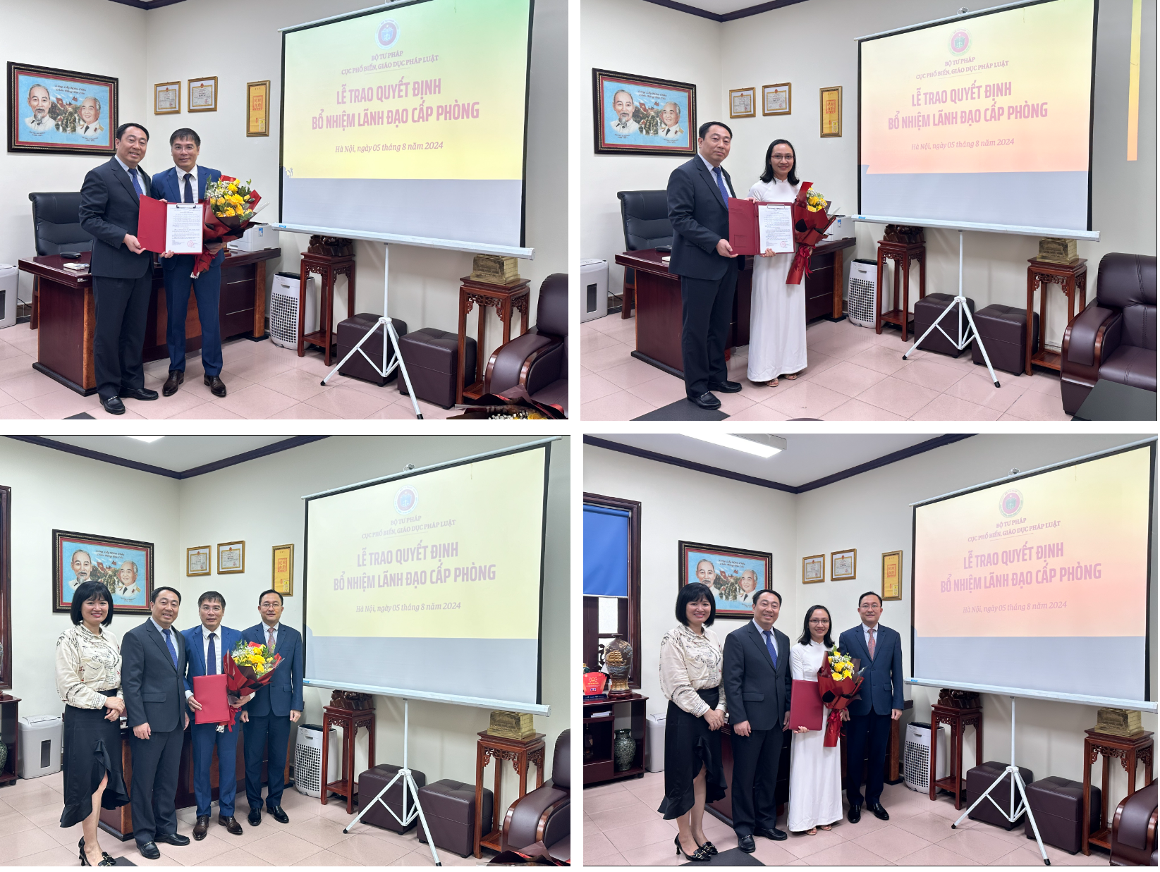 Lãnh đạo Cục Phổ biến, giáo dục pháp luật trao Quyết định, chụp ảnh lưu niệm cùng 02 Đ/c lãnh đạo cấp phòng mới được bổ nhiệm.