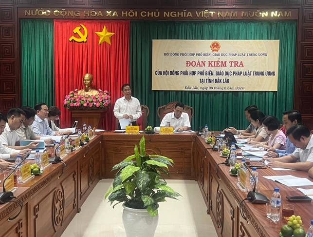 Kết luận tại buổi làm việc, đồng chí Triệu Văn Cường, Thứ trưởng Bộ Nội vụ, Ủy viên Hội đồng phối hợp PBGDPL trung ương ghi nhận những kết quả đạt được trong công tác PBGDPL, hòa giải ở cơ sở, đánh giá, công nhận cấp xã đạt chuẩn tiếp cận pháp luật, hỗ trợ pháp lý cho doanh nghiệp nhỏ và vừa thời gian qua. Thứ trưởng Bộ Nội vụ Triệu Văn Cường đề nghị tỉnh Đắk Lắk thực hiện tốt các nhiệm vụ trọng tâm. Cụ thể: Phát huy vị trí, vai trò, trách nhiệm của Hội đồng phối hợp các cấp, các cơ quan thành viên trong triển khai thực hiện nhiệm vụ. Chủ động nắm bắt, tháo gỡ khó khăn, vướng mắc thực tiễn trong công tác PBGDPL trên địa bàn. Thực hiện có hiệu quả, đúng tiến độ các nhiệm vụ, đề án PBGDPL, trong đó tập trung vào Đề án "Tổ chức truyền thông chính sách có tác động lớn đến xã hội trong quá trình xây dựng văn bản quy phạm pháp luật giai đoạn 2022-2027"; Đề án "Tăng cường năng lực tiếp cận pháp luật của người dân"; "Đề án "Nâng cao năng lực cho đội ngũ báo cáo viên pháp luật, tuyên truyền viên pháp luật thực hiện PBGDPL tại vùng đồng bào dân tộc thiểu số và miền núi, giai đoạn 2024-2030" và "Đề án "Nâng cao năng lực đội ngũ hòa giải viên ở cơ sở giai đoạn 2024-2030". Đổi mới, đa dạng hóa các hình thức PBGDPL phù hợp với từng đối tượng, địa bàn. Đặc biệt là đồng bào dân tộc thiểu số trên địa bàn, cần xây dựng, nhân rộng mô hình PBGDPL có hiệu quả, các cách làm hay, có sức lan tỏa sâu rộng trong nhân dân. Tăng cường ứng dụng công nghệ thông tin, chuyển đổi số trong công tác PBGDPL. Gắn kết chặt chẽ giữa công tác hòa giải cơ sở và công tác dân vận. Chú trọng công tác tập huấn, bồi dưỡng, nâng cao chất lượng, hiệu quả hoạt động của đội ngũ báo cáo viên pháp luật, tuyên truyền viên pháp luật, hòa giải viên. Phát huy vai trò của luật gia, luật sư, người có uy tín trong cộng đồng dân cư, già làng, trưởng bản.