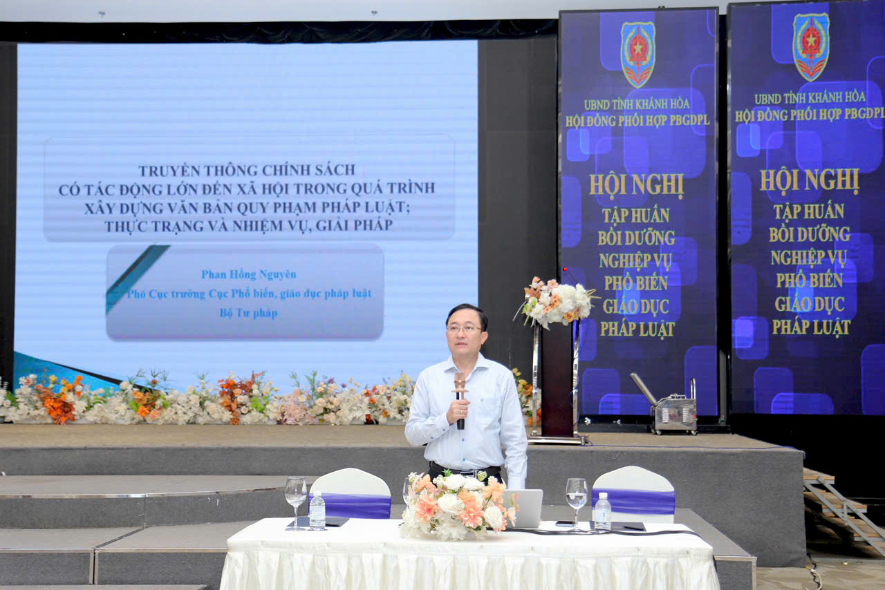 Phát biểu khai mạc tại Hội nghị, đồng chí Đặng Văn Khánh - Phó Giám đốc Sở Tư pháp, Phó Chủ tịch Hội đồng phối hợp phổ biến, giáo dục pháp luật tỉnh Khánh Hoà nhấn mạnh tầm quan trọng, ý nghĩa của công tác truyền thông dự thảo chính sách và phổ biến, giáo dục pháp luật trong việc đưa chính sách, pháp luật vào đời sống, tạo sự đồng thuận trong xã hội trong thực hiện các văn bản khi được thông qua. Thời gian vừa qua, Hội đồng phối hợp PBGDPL, Sở Tư pháp đã quan tâm tổ chức tập huấn kiến thức pháp luật, kỹ năng PBGDPL cho báo cáo viên pháp luật và công chức của các sở, ngành.