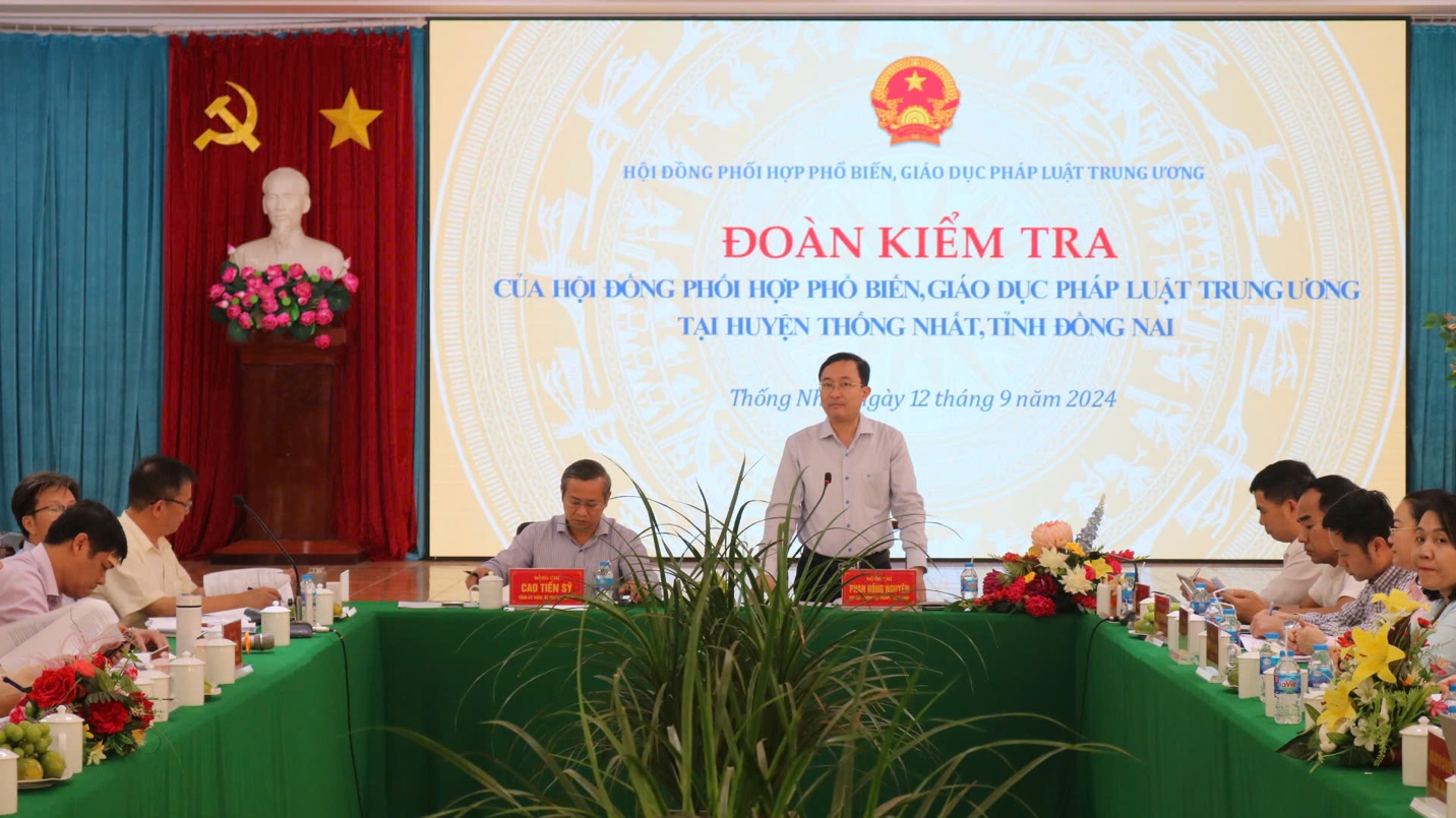 Sáng ngày 12/9/2024, Đoàn Kiểm tra của Hội đồng phối hợp phổ biến, giáo dục pháp luật (PBGDPL) trung ương làm việc tại huyện Thống Nhất, tỉnh Đồng Nai. Đồng chí Phan Hồng Nguyên, Phó Cục trưởng Cục PBGDPL, Phó Tổ trưởng Tổ Thư ký giúp việc Hội đồng phối hợp PBGDPL trung ương và đồng chí Cao Tiến Sĩ, Tỉnh uỷ viên, Bí thư Huyện uỷ huyện Thống Nhất, tỉnh Đồng Nai chủ trì buổi làm việc. Tham gia Đoàn kiểm tra có đại diện Vụ Pháp chế các bộ, ngành: Giáo dục và Đào tạo, Kế hoạch và Đầu tư, Tài nguyên và Môi trường, Tài chính, Ngân hàng Nhà nước Việt Nam; Liên đoàn Luật sư Việt Nam, Liên đoàn Thương mại và Công nghiệp Việt Nam. Về phía địa phương, có bà Võ Thị Xuân Đào-Giám đốc Sở Tư pháp tỉnh Đồng Nai cùng đại diện lãnh đạo các ban, ngành của địa phương.