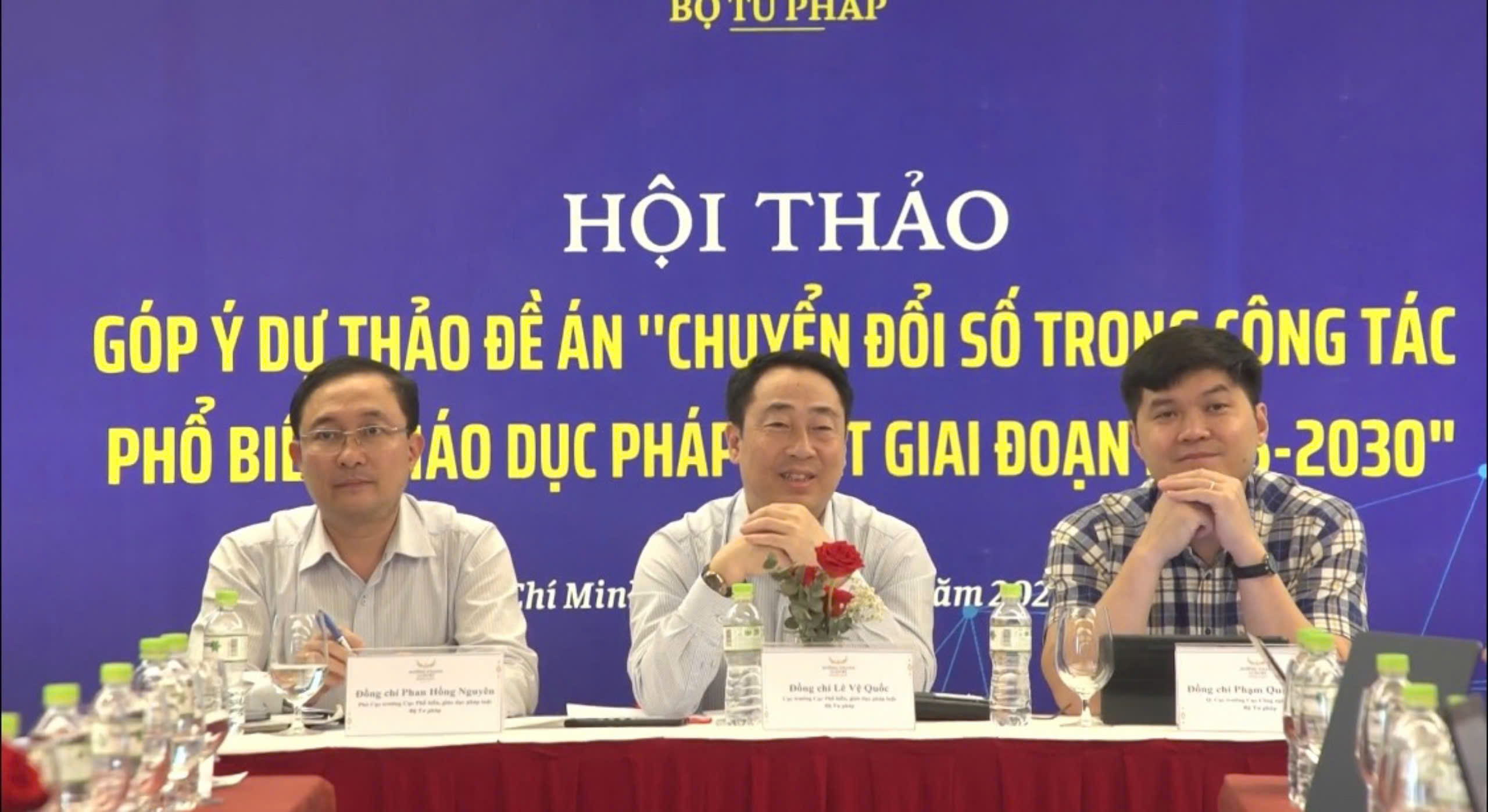 Chiều 11/09, tại thành phố Hồ Chí Minh, Bộ Tư pháp tổ chức Hội thảo lấy ý kiến góp ý về dự thảo “ Đề án chuyển đổi số trong công tác phổ biến, giáo dục pháp luật giai đoạn 2025-2030 ” do TS. Lê Vệ Quốc, Cục trưởng Cục Phổ biến, giáo dục pháp luật , Bộ Tư pháp , Phó Trưởng ban Ban soạn thảo Đề án và ô ng Phạm Quang Hiếu, Quyền Cục trưởng Cục Công nghệ thông tin, Bộ Tư pháp đồng chủ trì Hội thảo.
