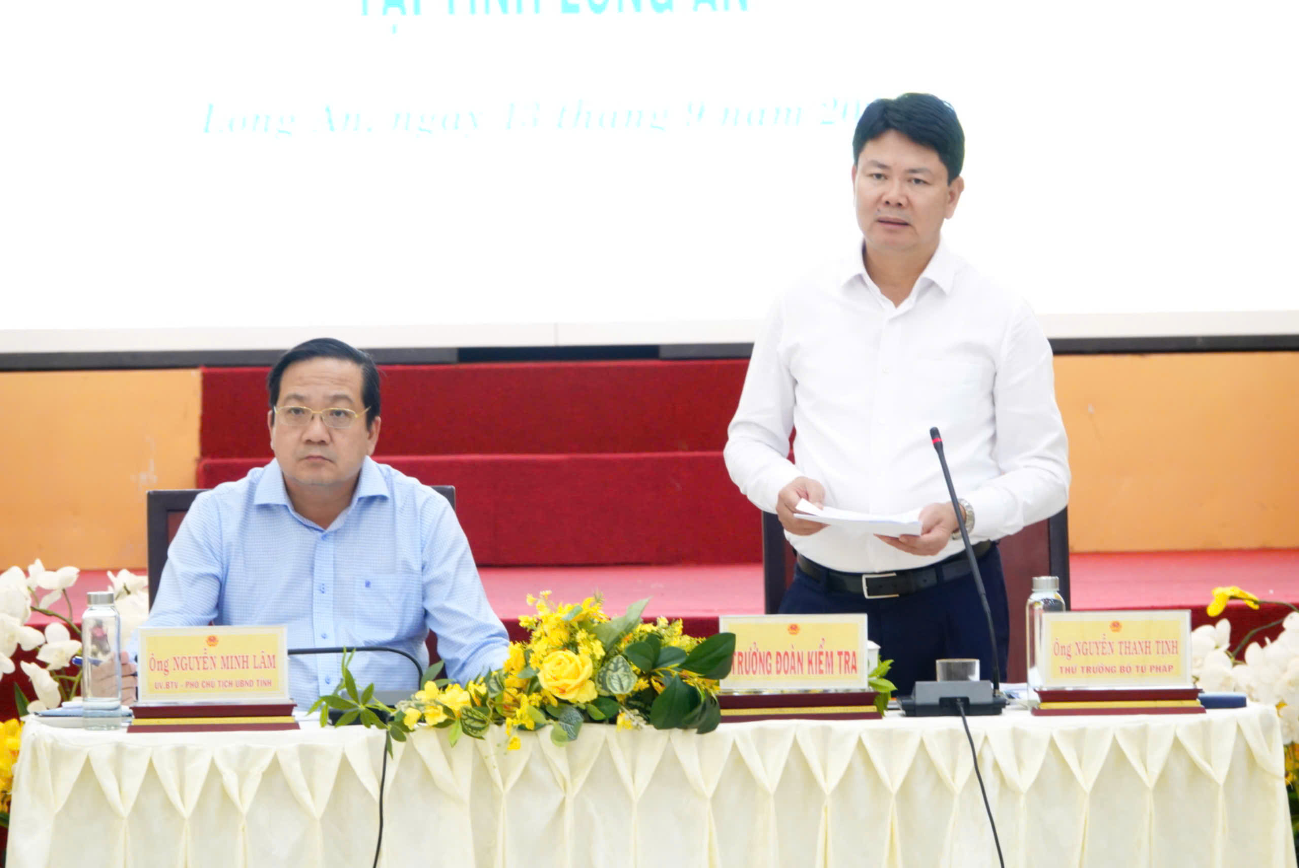 Sáng ngày 13/9, Đoàn kiểm tra của Hội đồng phối hợp phổ biến, giáo dục pháp luật (PBGDPL) trung ương làm việc tại Ủy ban nhân dân (UBND) tỉnh Long An. Đồng chí Nguyễn Thanh Tịnh, Thứ trưởng Bộ Tư pháp, Phó Chủ tịch Hội đồng phối hợp PBGDPL trung ương và đồng chí Nguyễn Minh Lâm, Phó Chủ tịch UBND tỉnh Long An chủ trì buổi làm việc. Tham gia Đoàn kiểm tra còn có đồng chí Nguyễn Lam, Phó Trưởng ban Ban Dân vận Trung ương, thành viên Hội đồng phối hợp PBGDPL trung ương, đồng chí Võ Tân Thành, Phó Chủ tịch Liên đoàn Thương mại và Công nghiệp Việt Nam, thành viên Hội đồng phối hợp PBGDPL trung ương và đại diện các bộ, ngành: Kế hoạch và Đầu tư, Giáo dục và Đào tạo, Tài chính, Tư pháp, Ngân hàng Nhà nước Việt Nam; Liên đoàn Luật sư Việt Nam, Liên đoàn Thương mại và Công nghiệp Việt Nam. Về phía địa phương, tham gia buổi làm việc có đồng chí Phan Thị Mỹ Dung-Phó Chủ tịch Thường trực Hội đồng phối hợp PBGDPL tỉnh, Giám đốc Sở Tư pháp và đại diện Lãnh đạo các sở, ban, ngành trên địa bàn tỉnh Long An.