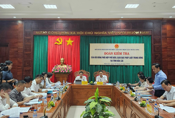 Chiều ngày 08/8/2024, Đoàn kiểm tra của Hội đồng phối hợp phổ biến, giáo dục pháp luật trung ương (Hội đồng) do đồng chí Triệu Văn Cường, Thứ trưởng Bộ Nội vụ, Ủy viên Hội đồng làm Trưởng đoàn đã làm việc với Hội đồng phối hợp phổ biến, giáo dục pháp luật (PBGDPL) tỉnh Đắk Lắk. Tham gia Đoàn kiểm tra có đồng chí Lê Thị Kim Thanh, Phó Chủ tịch Hội Luật gia Việt Nam, Ủy viên Hội đồng và một số thành viên là đại diện ban, bộ, ngành, đoàn thể, thành viên Tổ Thư ký giúp việc Hội đồng: Cục Phổ biến, giáo dục pháp luật, Bộ Tư pháp; Vụ Dân vận các cơ quan nhà nước, Ban Dân vận Trung ương; Vụ Pháp chế, Vụ Tiền lương, Bộ Nội vụ; Vụ Pháp chế, Bộ Tài nguyên và Môi trường; Vụ Pháp chế, Bộ Giáo dục và Đào tạo; Ban Pháp luật, Hội Cựu chiến binh Việt Nam.