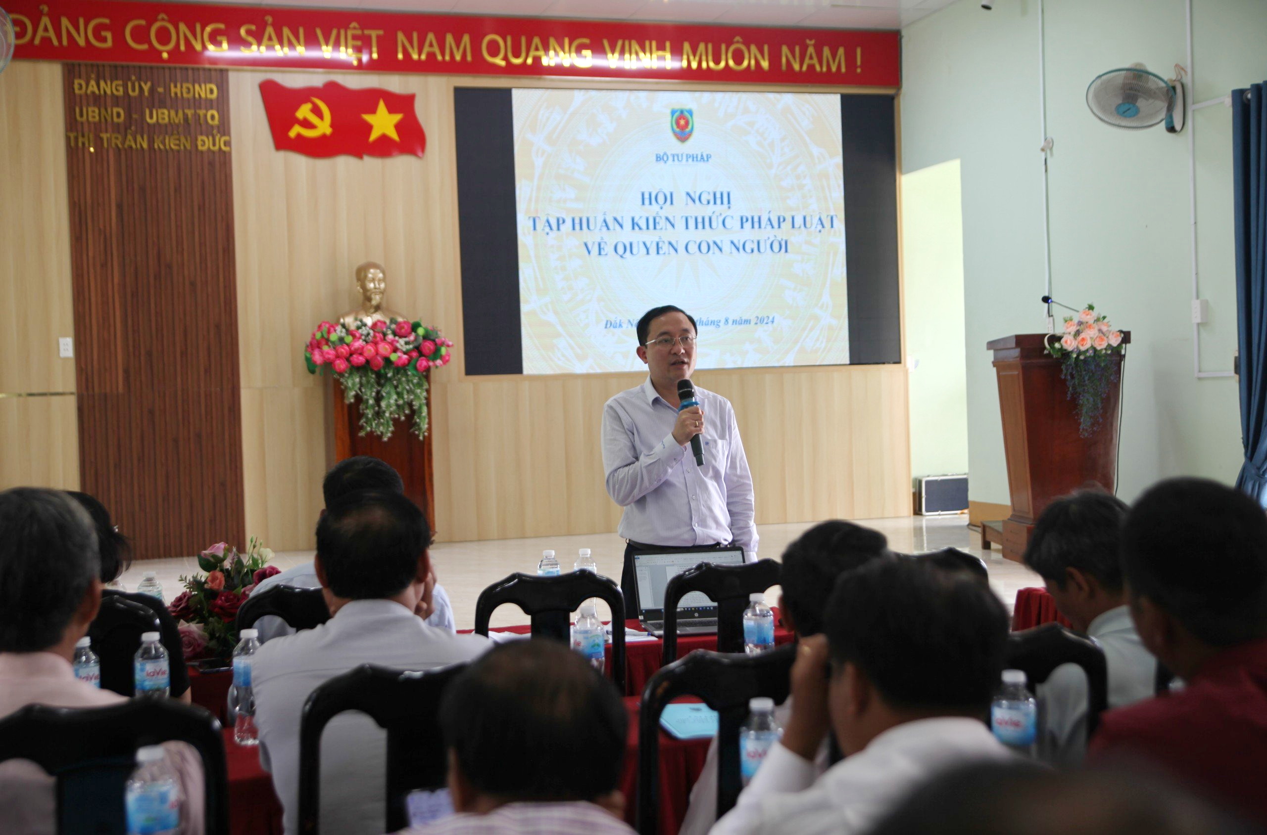 Triển khai Kế hoạch thực hiện Đề án “Truyền thông về quyền con người ở Việt Nam giai đoạn 2023-2028” năm 2024 của Bộ Tư pháp (Kèm theo Quyết định số 153/QĐ-BTP ngày 02/02/2024 của Bộ trưởng Bộ Tư pháp), sáng ngày 19/8/2024, Bộ Tư pháp tổ chức Hội nghị tập huấn kiến thức pháp luật về quyền con người tại thị trấn Kiến Đức, huyện Đắk R’Lấp, tỉnh Đắk Nông.