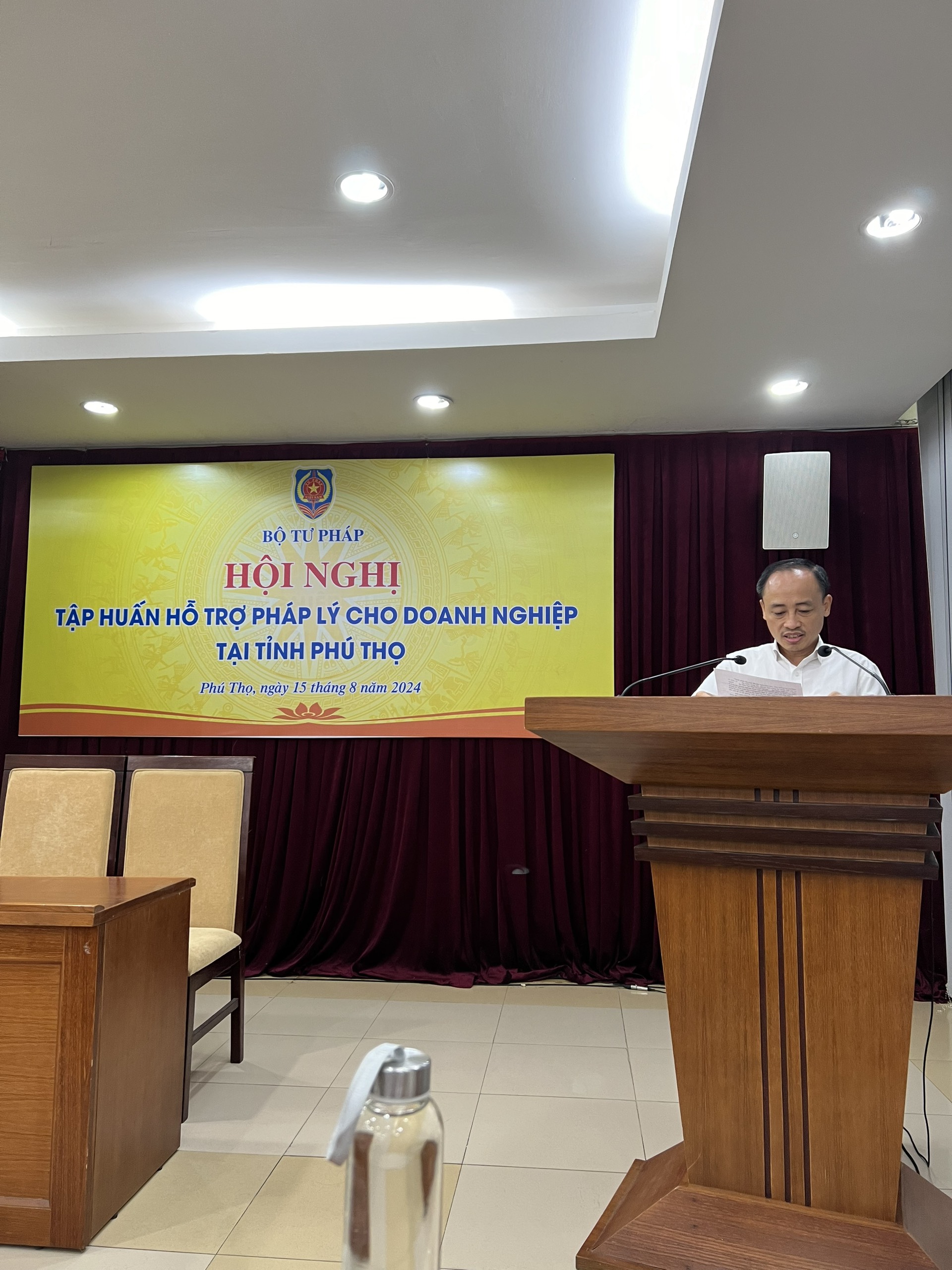 Thực hiện các Quyết định của Bộ trưởng Bộ Tư pháp: số 121/QĐ-BTP ngày 29/01/2024 phê duyệt Kế hoạch công tác năm 2024 của Cục Phổ biến, giáo dục pháp luật; số 972/QĐ-BTP ngày 30/5/2024 sửa đổi, bổ sung Quyết định số 2170/QĐ-BTP ngày 07/9/2023 của Bộ trưởng Bộ Tư pháp ban hành Kế hoạch triển khai các hoạt động năm 2024 của Chương trình hỗ trợ pháp lý liên ngành cho doanh nghiệp nhỏ và vừa giai đoạn 2021 – 2025 và ban hành Kế hoạch thực hiện Đề án “Nâng cao chất lượng, hiệu quả công tác hỗ trợ pháp lý cho doanh nghiệp giai đoạn 2021 – 2030” năm 2024; đồng thời trên cơ sở đề nghị của Sở Tư pháp tỉnh Phú Thọ, ngày 15/8/2024 tại Trung tâm Hội nghị tỉnh Phú Thọ, Bộ Tư pháp tổ chức Hội nghị hỗ trợ pháp lý cho doanh nghiệp tại tỉnh Phú Thọ. Tham dự Hội nghị có đồng chí Nguyễn Kiên Cường – Phó Giám đốc Sở Tư pháp tỉnh Phú Thọ. Cùng dự Hội nghị có hơn 100 đại biểu là đại diện lãnh đạo các phòng, đơn vị trực thuộc Sở Tư pháp tỉnh Phú Thọ; đại diện Đảng ủy Khối các doanh nghiệp tỉnh; đại diện lãnh đạo, cán bộ, công chức làm công tác pháp chế và hỗ trợ pháp lý cho doanh nghiệp tại các Sở, ban, ngành; đại diện lãnh đạo, cán bộ làm công tác pháp chế trong các doanh nghiệp nhà nước, đơn vị sự nghiệp công lập; đại diện lãnh đạo các Hiệp hội, Hội Doanh nghiệp tỉnh; chủ doanh nghiệp, người quản lý, điều hành và cán bộ làm công tác pháp chế của các doanh nghiệp nhỏ và vừa trên địa bàn tỉnh Phú Thọ. Nội dung Hội nghị tập trung giới thiệu một số vấn đề cần lưu ý về các quy định của pháp luật doanh nghiệp, các nội dung cơ bản, điểm mới của Luật Đất đai năm 2024 liên quan đến doanh nghiệp. Đồng thời tại Hội nghị, Bộ Tư pháp thực hiện lồng ghép khảo sát nhu cầu hỗ trợ pháp lý của doanh nghiệp nhỏ và vừa thông qua phát phiếu khảo sát.