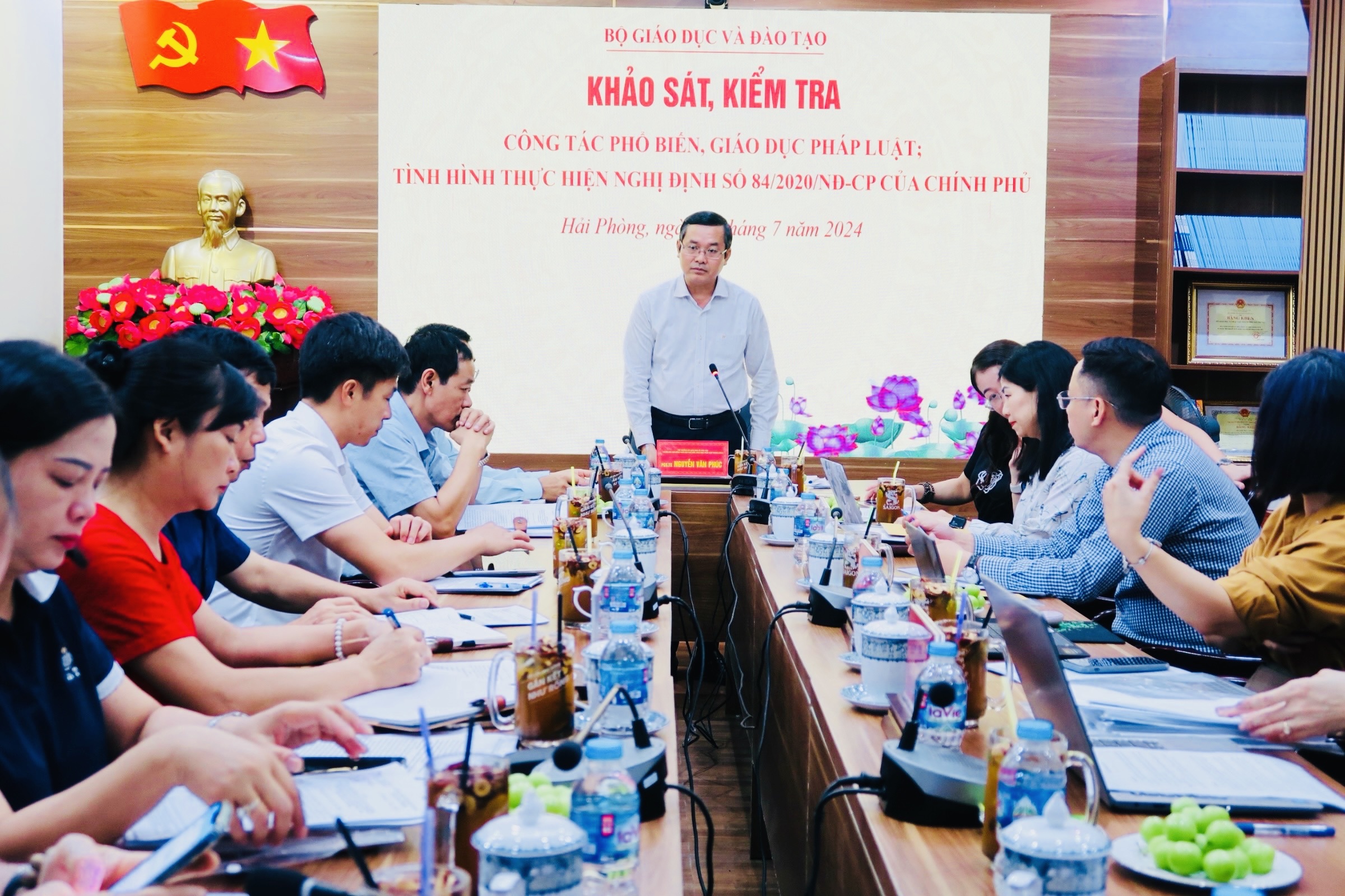 Thực hiện Quyết định số 51/QĐ-HĐPH ngày 04/4/2024 của Chủ tịch Hội đồng phối hợp phổ biến, giáo dục pháp luật trung ương (sau đây gọi là Hội đồng) ban hành Kế hoạch hoạt động của Hội đồng năm 2024 và Kế hoạch số 741/KH-BGDĐT ngày 17/6/2024 của Bộ trưởng Bộ Giáo dục và Đào tạo về khảo sát, kiểm tra công tác phổ biến, giáo dục pháp luật (PBGDPL) trong nhà trường, trong hai ngày 18-19/7/2024, Đoàn khảo sát, kiểm tra công tác PBGDPL trong nhà trường do đồng chí Nguyễn Văn Phúc, Thứ trưởng Bộ Giáo dục và Đào tạo, Thành viên Hội đồng phối hợp PBGDPL trung ương làm Trưởng đoàn đã có buổi làm việc tại Sở Giáo dục và Đào tạo thành phố Hải Phòng và trường Đại học Hải Phòng. Đồng chí Mai Thị Anh, Vụ trưởng Vụ Pháp chế, Bộ Giáo dục và Đào tạo, một số công chức của Vụ Pháp chế, đại diện của Cục Phổ biến, giáo dục pháp luật, Bộ Tư pháp cùng tham dự Đoàn kiểm tra.