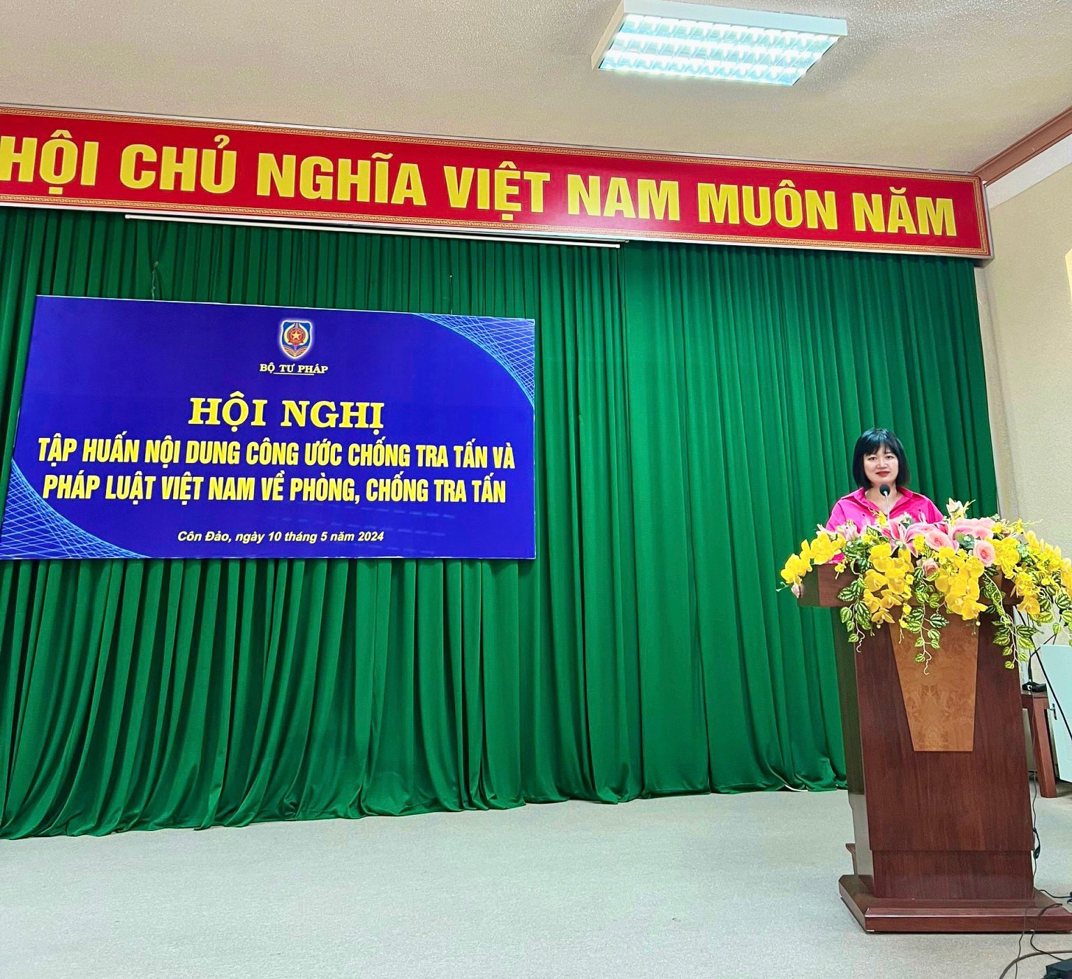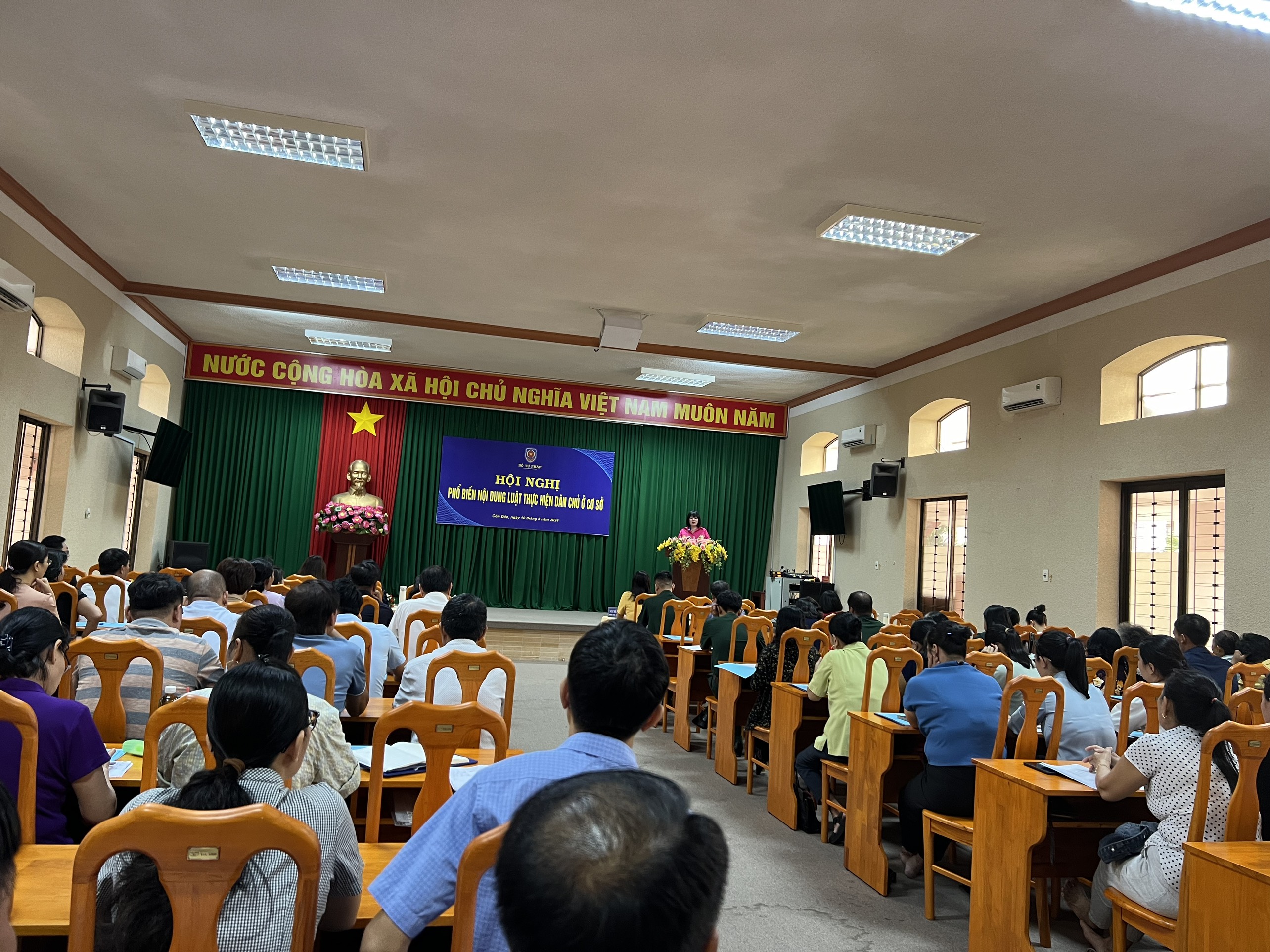Thực hiện Quyết định số 1252/QĐ-TTg ngày 26/9/2019 của Thủ tướng Chính phủ phê duyệt Kế hoạch tăng cường thực thi hiệu quả Công ước quốc tế về các quyền dân sự chính trị (ICCPR) và các khuyến nghị của Ủy ban Nhân quyền Liên hợp quốc và Kế hoạch năm 2024 của Bộ Tư pháp thực hiện Đề án “Tuyên truyền, phổ biến trong cán bộ, công chức, viên chức và nhân dân về nội dung của Công ước quyền dân sự chính trị và pháp luật Việt Nam về quyền dân sự chính trị” ban hành kèm theo Quyết định số 153/QĐ-BTP ngày 02/02/2024 của Bộ trưởng Bộ Tư pháp, vào ngày 10/5/2024, tại trụ sở Uỷ ban nhân dân huyện Côn Đảo, tỉnh Bà Rịa – Vũng Tàu, Bộ Tư pháp đã tổ chức Hội nghị tập huấn Luật Thực hiện dân chủ ở cơ sở. Tham dự Hội nghị có hơn 100 đại biểu là cán bộ, công chức một số cơ quan, đơn vị cấp huyện, báo cáo viên pháp luật cấp huyện, tuyên truyền viên pháp luật, người có uy tín tại cộng đồng, trưởng các cụm dân cư và đội ngũ hoà giải viên ở cơ sở… trên địa bàn huyện Côn Đảo. Đồng chí Ngô Quỳnh Hoa - Phó Cục trưởng Cục Phổ biến, giáo dục pháp luật, Bộ Tư pháp chủ trì Hội nghị. Tham dự Hội nghị còn có đồng chí Nguyễn Thụy Nga - Phó Chủ tịch Uỷ ban nhân dân huyện Côn Đảo và đại diện Sở Tư pháp tỉnh Bà Rịa - Vũng Tàu.