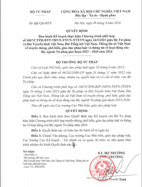 Nhằm thực hiện có hiệu quả các nhiệm vụ tại Chương trình phối hợp số 1067/CTPH-THVN-TNVN-TTXVN ngày 24/3/2023 giữa Bộ Tư pháp và Đài Truyền hình Việt Nam, Đài Tiếng nói Việt Nam, Thông tấn xã Việt Nam về truyền thông, phổ biến, giáo dục pháp luật và thông tin về hoạt động của Bộ, ngành Tư pháp giai đoạn 2023 - 2028 (Chương trình phối hợp số 1067) trong năm 2024 và nâng cao hiệu quả, phát huy thế mạnh của các cơ quan truyền thông chủ lực trong việc truyền tải đầy đủ, kịp thời thông tin pháp luật, phổ biến, giáo dục pháp luật (PBGDPL), thông tin về hoạt động của Bộ, ngành Tư pháp, bảo đảm chính xác, kịp thời, nâng cao hiểu biết pháp luật, ý thức chấp hành pháp luật trong các tầng lớp Nhân dân, ngày 19/4/2024, Bộ Tư pháp đã ban hành Quyết định số 697/BTP-PBGDPL về việc ban hành Kế hoạch thực hiện Chương trình phối hợp số 1067 năm 2024.