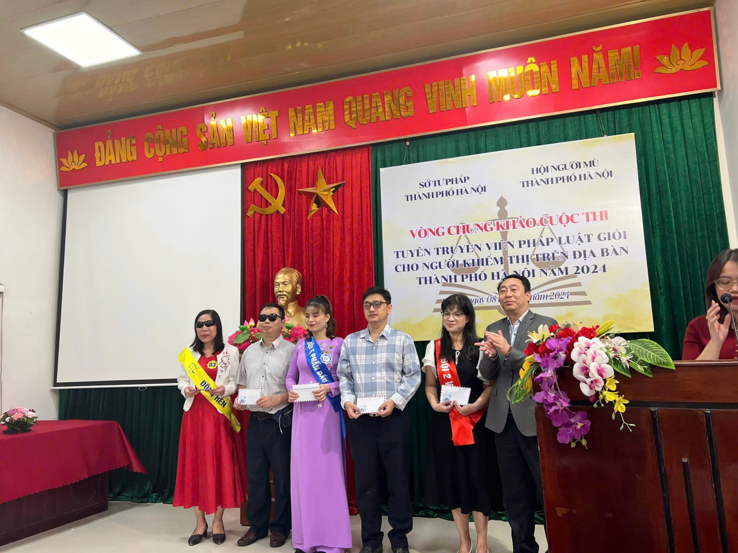 Hưởng ứng Ngày Pháp luật nước Cộng hòa xã hội chủ nghĩa Việt Nam năm 2024, nhằm nâng cao nhận thức của xã hội về quyền của người khuyết tật cũng như tăng cường hiểu biết pháp luật cho người khuyết tật nói chung, người khiếm thị nói riêng, năm 2024, Hội Người mù thành phố Hà Nội phối hợp với Sở Tư pháp thành phố Hà Nội tổ chức Cuộc thi “Tuyên truyền viên pháp luật giỏi cho người khiếm thị trên địa bàn thành phố Hà Nội”. Vòng Sơ khảo của Cuộc thi đã được tổ chức ngày 17/10/2024 với sự tham dự của 05 đội thi đại diện cho 05 cụm thi đua thuộc Hội Người mù thành phố Hà Nội . Căn cứ kết quả Vòng Sơ khảo, vào sáng ngày 08/11/2024, Vòng Chung khảo của Cuộc thi đã được tổ chức thành công với sự tham dự của 03 đội thi xuất sắc gồm: cụm 2, cụm 4 và cụm 5. Đồng chí Lê Vệ Quốc - Cục trưởng Cục Phổ biến, giáo dục pháp luật, Bộ Tư pháp; đồng chí Phạm Thị Thanh Hương - Phó Giám đốc Sở Tư pháp thành phố Hà Nội, bà Đinh Việt Anh - Phó Chủ tịch Hội Người mù Việt Nam, Lãnh đạo Hội Người mù thành phố Hà Nội tham dự Vòng Chung khảo Cuộc thi.