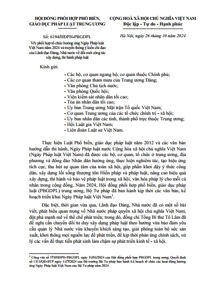 Triển khai ngày Pháp luật Việt Nam năm 2024 theo quy định của Luật Phổ biến, giáo dục pháp luật năm 2012, gắn với truyền thông kịp thời ý kiến chỉ đạo của Lãnh đạo Đảng, Nhà nước trong thời gian vừa qua, đặc biệt là các bài viết, phát biểu quan trọng của đồng chí Tổng Bí thư Tô Lâm về Nhà nước pháp quyền XHCN Việt Nam, về đổi mới tư duy trong công tác xây dựng và thi hành pháp luật, ngày 26/10/2024, Hội đồng phối hợp phổ biến, giáo dục pháp luật (PBGDPL) trung ương đã ban hành Công văn số 6194/HĐPH-PBGDPL trong đó yêu cầu các cơ quan, tổ chức, địa phương tập trung một số nội dung trọng tâm và triển khai đợt cao điểm nhằm hưởng ứng Ngày Pháp luật năm 2024.