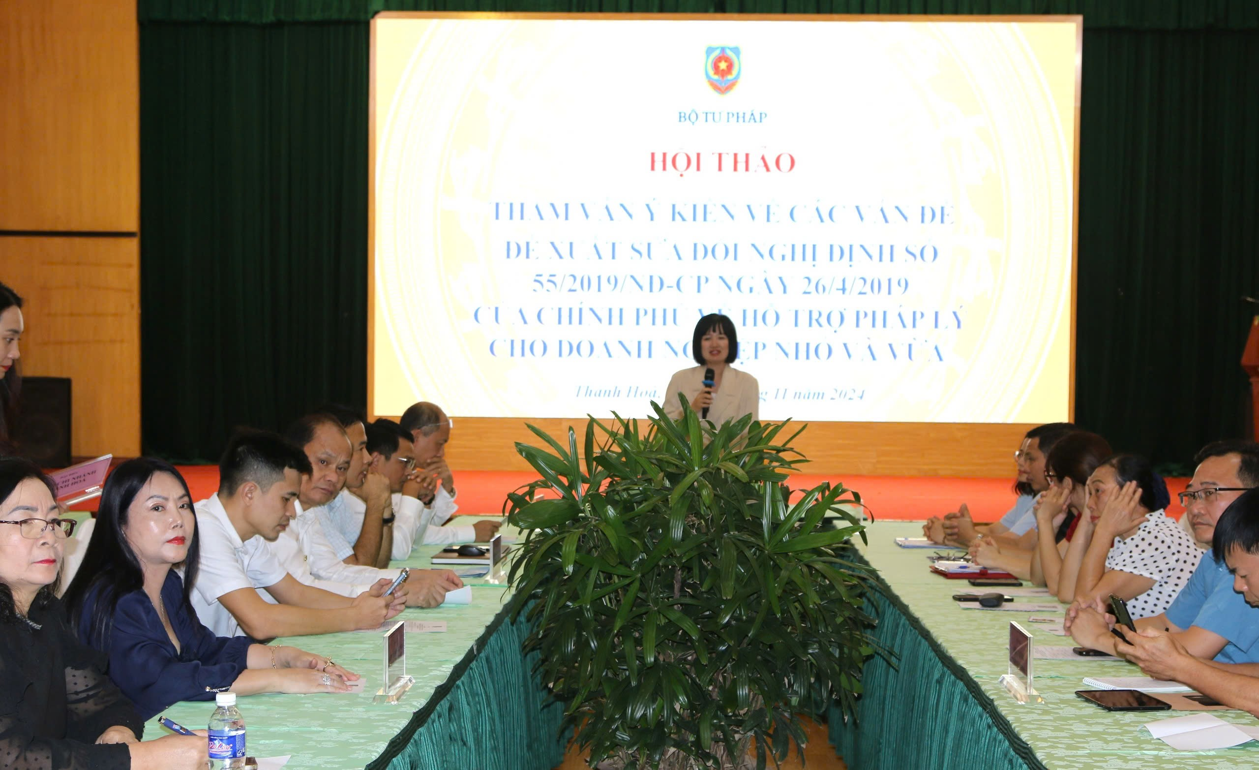 Chiều ngày 01/11/2024, tại Hội trường Khách Sạn Sao Mai, tỉnh Thanh Hóa, Cục Phổ biến giáo dục pháp luật (PBGDPL), Bộ Tư pháp phối hợp với Sở Tư pháp tỉnh Thanh Hoá tổ chức thành công Hội thảo tham vấn ý kiến đề xuất sửa đổi, bổ sung Nghị định số 55/2019/NĐ-CP ngày 24/6/2019 của Chính phủ về hỗ trợ pháp lý cho doanh nghiệp nhỏ và vừa. Đồng chí Ngô Quỳnh Hoa, Phó Cục trưởng Cục Phổ biến, giáo dục pháp luật, Bộ Tư pháp chủ trì Hội thảo.