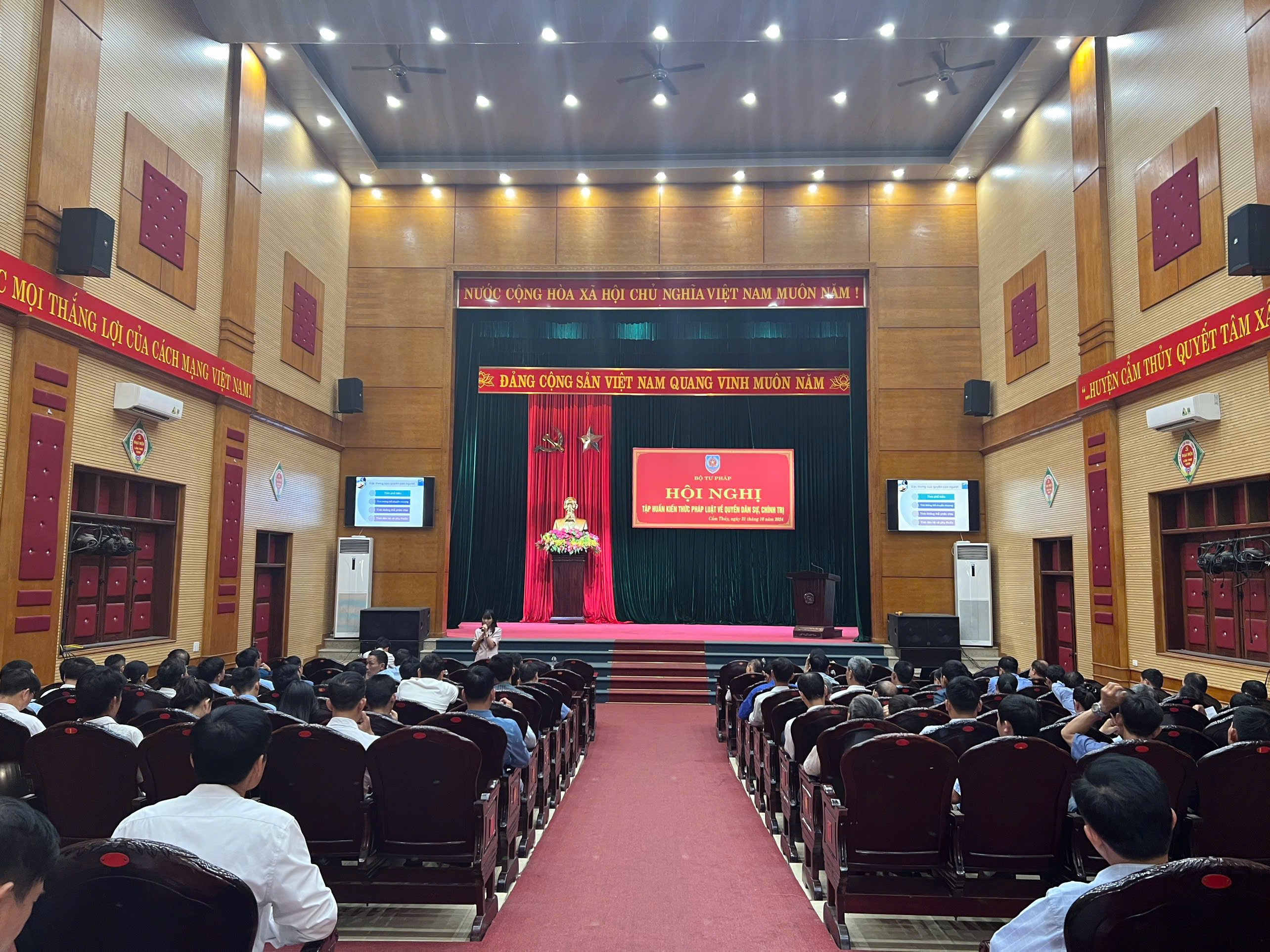 Nhằm thực hiện có hiệu quả Quyết định số 1252/QĐ-TTg 26/9/2019 của Thủ tướng Chính phủ phê duyệt Kế hoạch tăng cường thực thi hiệu quả Công ước quốc tế về quyền dân sự, chính trị (ICCPR) và các khuyến nghị của Ủy ban Nhân quyền Liên hợp quốc; đồng thời tiếp tục phổ biến sâu rộng nội dung cơ bản của Công ước ICCPR, pháp luật Việt Nam về các quyền dân sự, chính trị và thành tựu Việt Nam đạt được tại Báo cáo quốc gia lần thứ IV thực thi Công ước ICCPR, ngày 31/10/2024, Bộ Tư pháp tổ chức Hội nghị tập huấn kiến thức pháp luật về quyền dân sự, chính trị tại huyện Cẩm Thủy, tỉnh Thanh Hóa. Tham dự Hội nghị có đồng chí Lê Hữu Viên - Phó Giám đốc Sở Tư pháp tỉnh Thanh Hóa, đồng chí Trần Đức Hùng - Phó Chủ tịch Ủy ban nhân dân huyện Cẩm Thủy, tỉnh Thanh Hóa và khoảng 150 đại biểu là các báo cáo viên pháp luật huyện, tuyên truyền viên pháp luật xã, các trưởng thôn, hòa giải viên ở cơ sở, người có uy tín trong cộng đồng trên địa bàn huyện Cẩm Thủy, tỉnh Thanh Hóa.