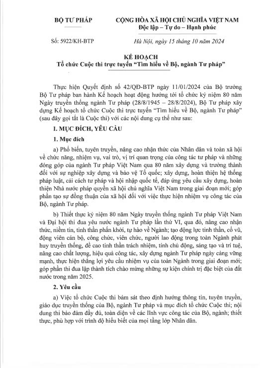 Thực hiện Quyết định số 42/QĐ-BTP ngày 11/01/2024 của Bộ trưởng Bộ Tư pháp ban hành Kế hoạch hoạt động hướng tới tổ chức kỷ niệm 80 năm Ngày truyền thống ngành Tư pháp (28/8/1945–28/8/2024), ngày 15/10/2024, Bộ Tư pháp đã ban hành Kế hoạch số 5922/KH-BTP tổ chức Cuộc thi trực tuyến “Tìm hiểu về Bộ, ngành Tư pháp” (sau đây gọi tắt là Cuộc thi).