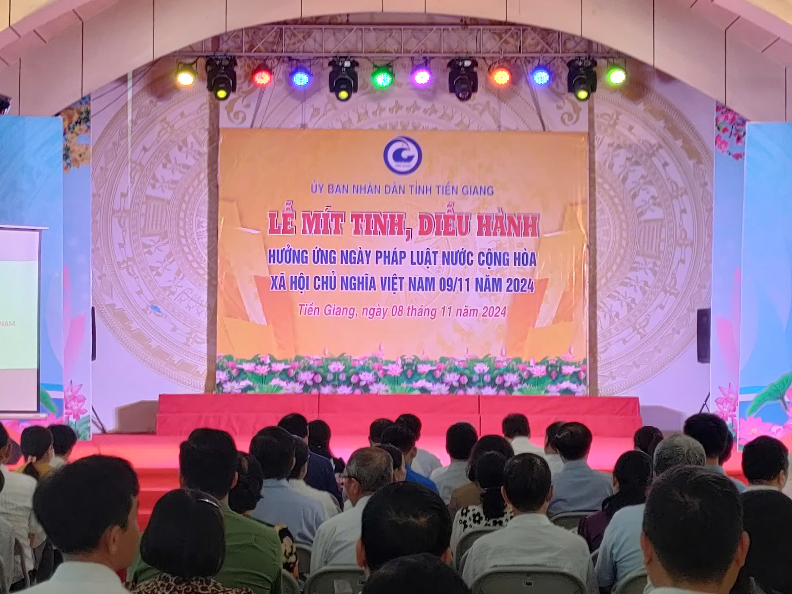 Hòa cùng không khí của cả nước tổ chức các hoạt động hưởng ứng Ngày Pháp luật Việt Nam, sáng ngày 08/11/2024, Ủy ban nhân dân (UBND) tỉnh Tiền Giang tổ chức Lễ Mít tinh, diễu hành hưởng ứng Ngày Pháp luật Việt Nam (09/11) năm 2024. Việc tổ chức hoạt động hưởng ứng Ngày pháp luật Việt Nam hàng năm nhằm tôn vinh Hiến pháp, pháp luật, đề cao tinh thần thượng tôn pháp luật trong Nhà nước pháp quyền xã hội chủ nghĩa Việt Nam.