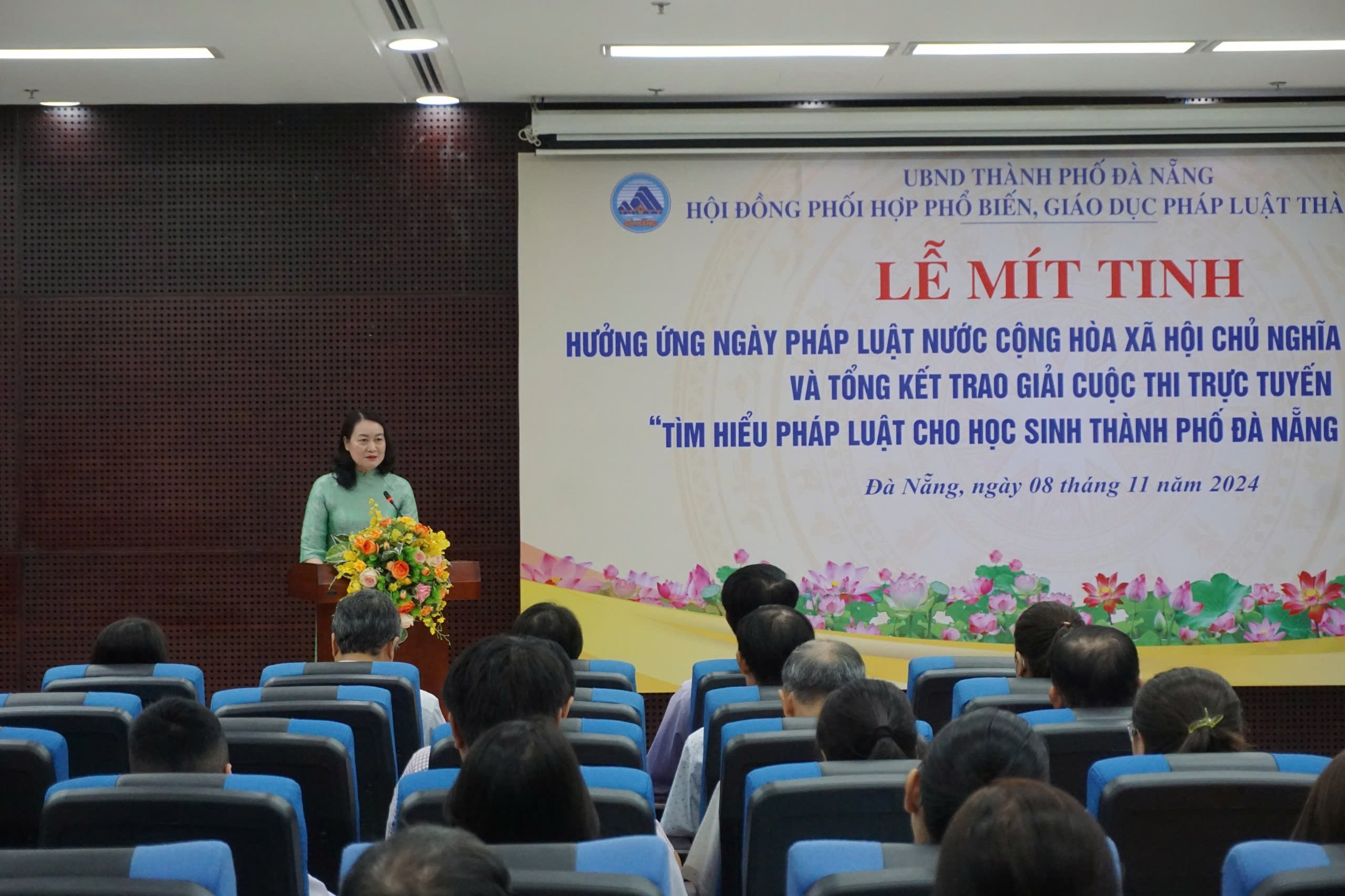Sáng ngày 08/11/2024, Hội đồng phối hợp phổ biến, giáo dục pháp luật thành phố Đà Nẵng tổ chức chức Lễ Mít tinh hưởng ứng Ngày Pháp luật nước Cộng hoà xã hội chủ nghĩa Việt Nam năm 2024 và tổng kết trao giải Cuộc thi trực tuyến “Tìm hiểu pháp luật cho học sinh thành phố Đà Nẵng năm 2024”. Tham dự buổi lễ có bà Trần Thị Kim Oanh - Giám đốc Sở Tư pháp, Phó Chủ tịch Thường trực Hội đồng phối hợp phổ biến, giáo dục pháp luật thành phố, đại diện lãnh đạo các sở, ban, ngành là thành viên của Hội đồng, Ủy ban nhân dân các quận, huyện, xã, phường trên địa bàn thành phố.